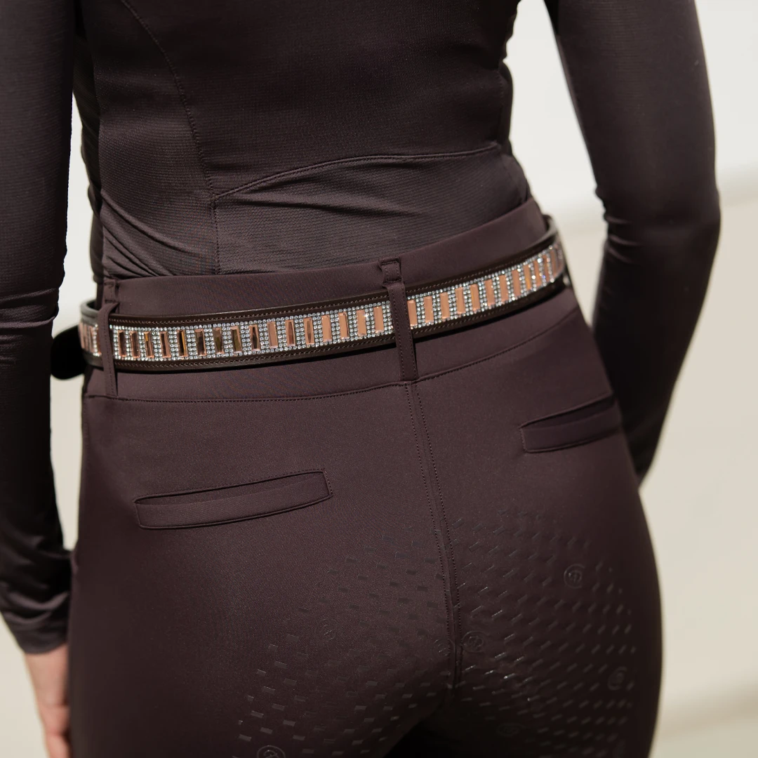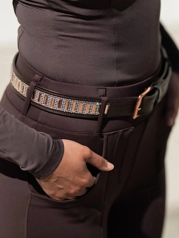 A belt that makes you shine bright like a winner! Created in 100% high quality buffalo leather and we use a sustainable dyeing process with fruits and vegetables, where no chemicals are used. Beautiful brown/purple leather with the ES logo engraved, rose gold crystals, and the buckle in rose gold. The belt is 3 cm wide.