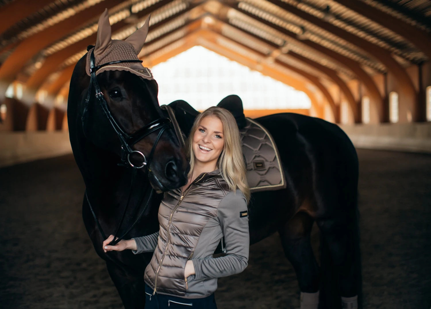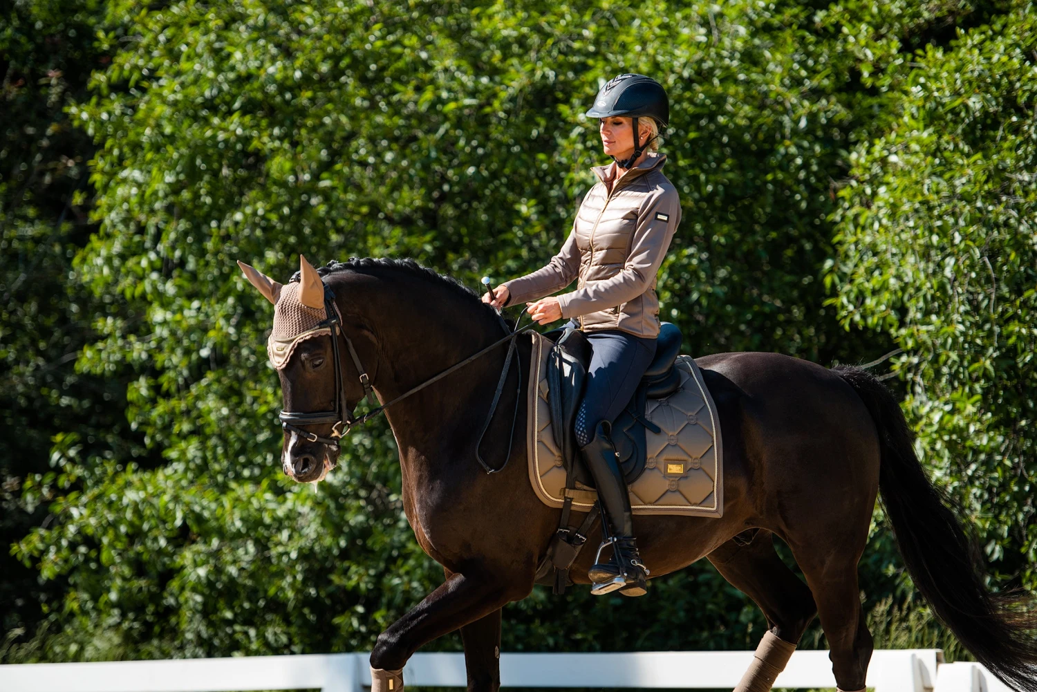 Exclusive dressage saddle pad in champagne beige and golden details, perfect for a day of training. Crafted in a shiny, dirt repellent material that breathes well and keeps your horse dry throughout sweaty session. Quilted with the Equestrian Stockholm logo. Style with other products from the same collection for a complete look.