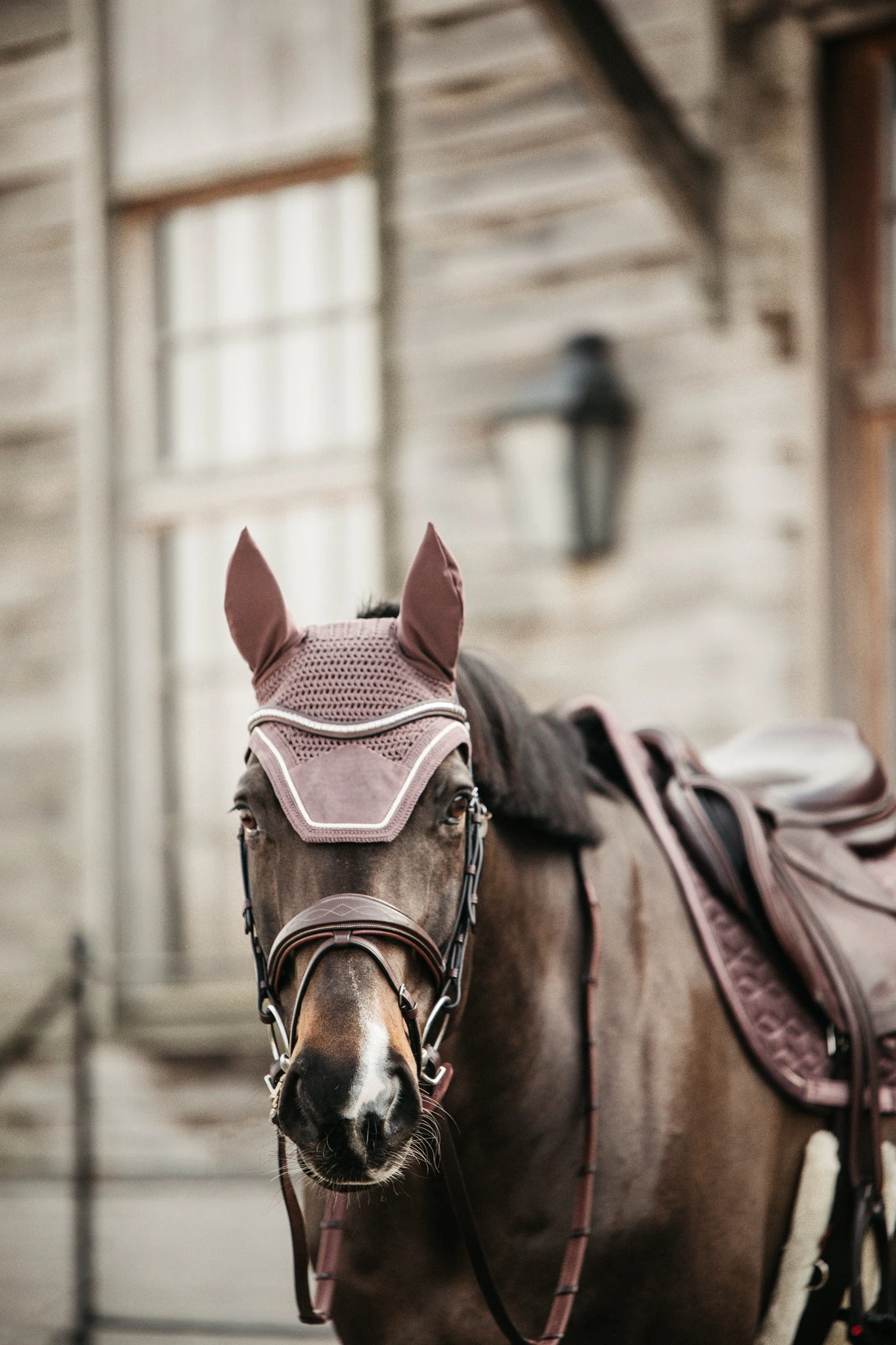 Our Fly Veil velvet is a combination of the modern American look and Kentucky Horsewear’s expertise. This fly veil is hand knitted for better durability, finished with fancy velvet details. The Fly Veil velvet protects the horse’s ears against flies while riding. The material around the ears is stretch and slim fit. The neck part is longer so it can’t slip. The Fly Veil velvet does not have a visible logo, therefore rider or sponsors can embroider their own logo. Hand washing only.