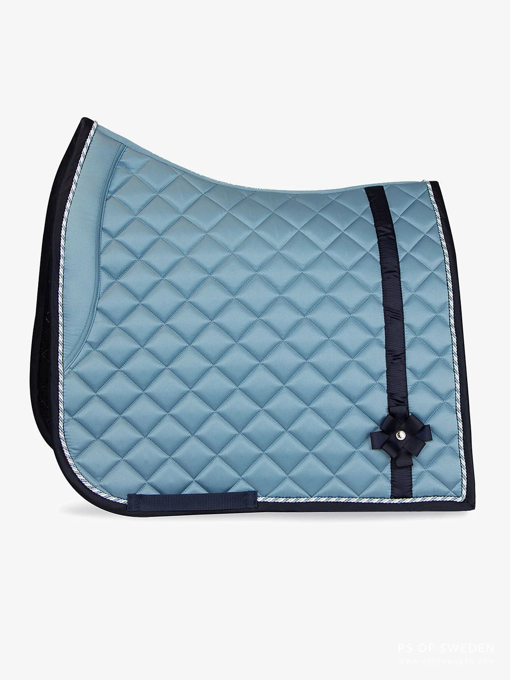 Anatomical saddle pad with a beautiful decorative bow and piping in Navy. The saddle pad has unique stop cushions to keep it in place and avoid friction. The inside is covered with an antibacterial quick-dry material that helps to transport away moisture and sweat.
