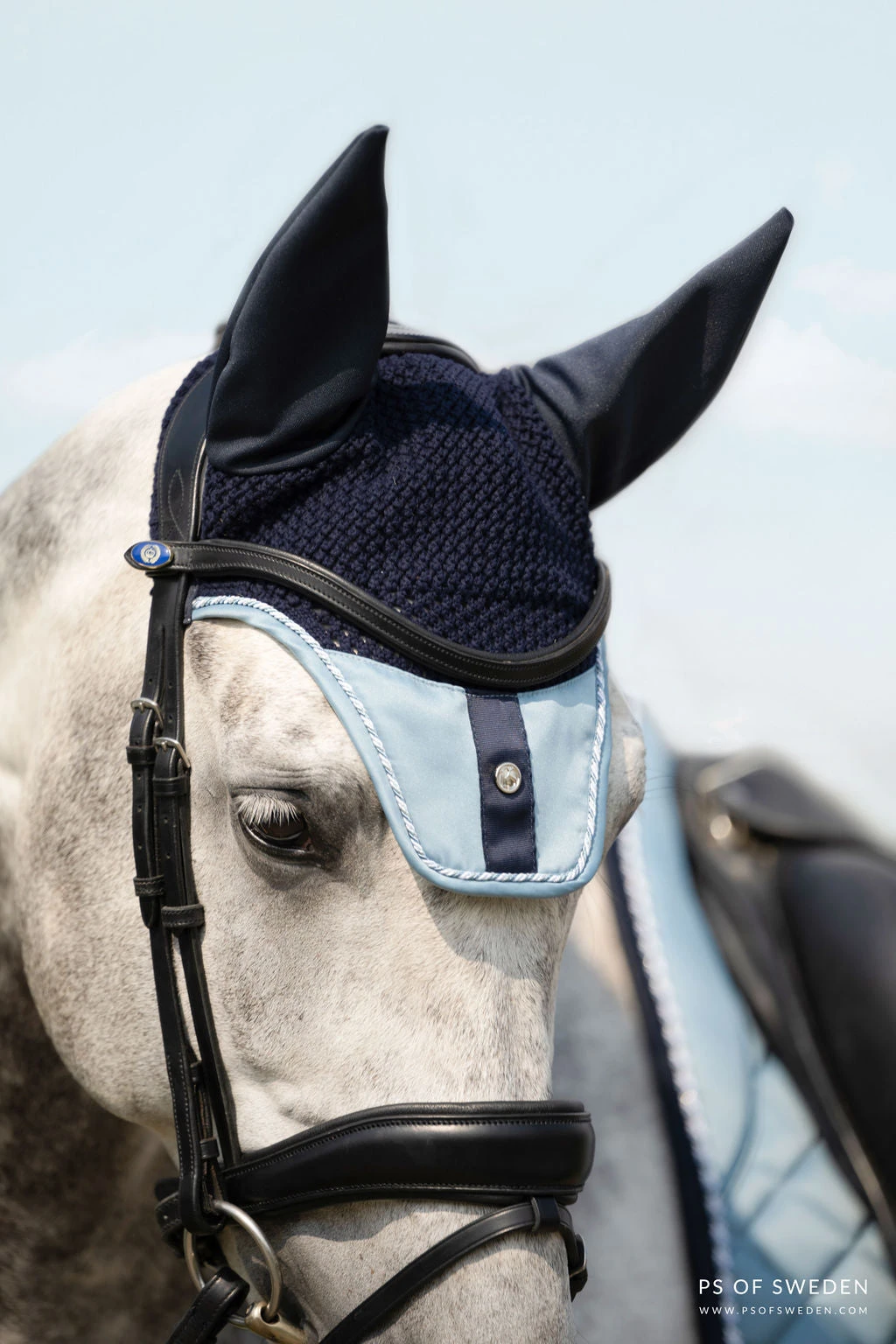 The ears are elastic and made of a stretchy, breathable, antimicrobial quick-dry material. The elastic fabric at the ears makes the fly hat fit all types of horses. It quickly transports moisture and sweat away during the whole ride. The fly hat has a classic, crocheted bottom, double piping, and the lower part of the fly hat is covered with shiny, dirt-repellent material.