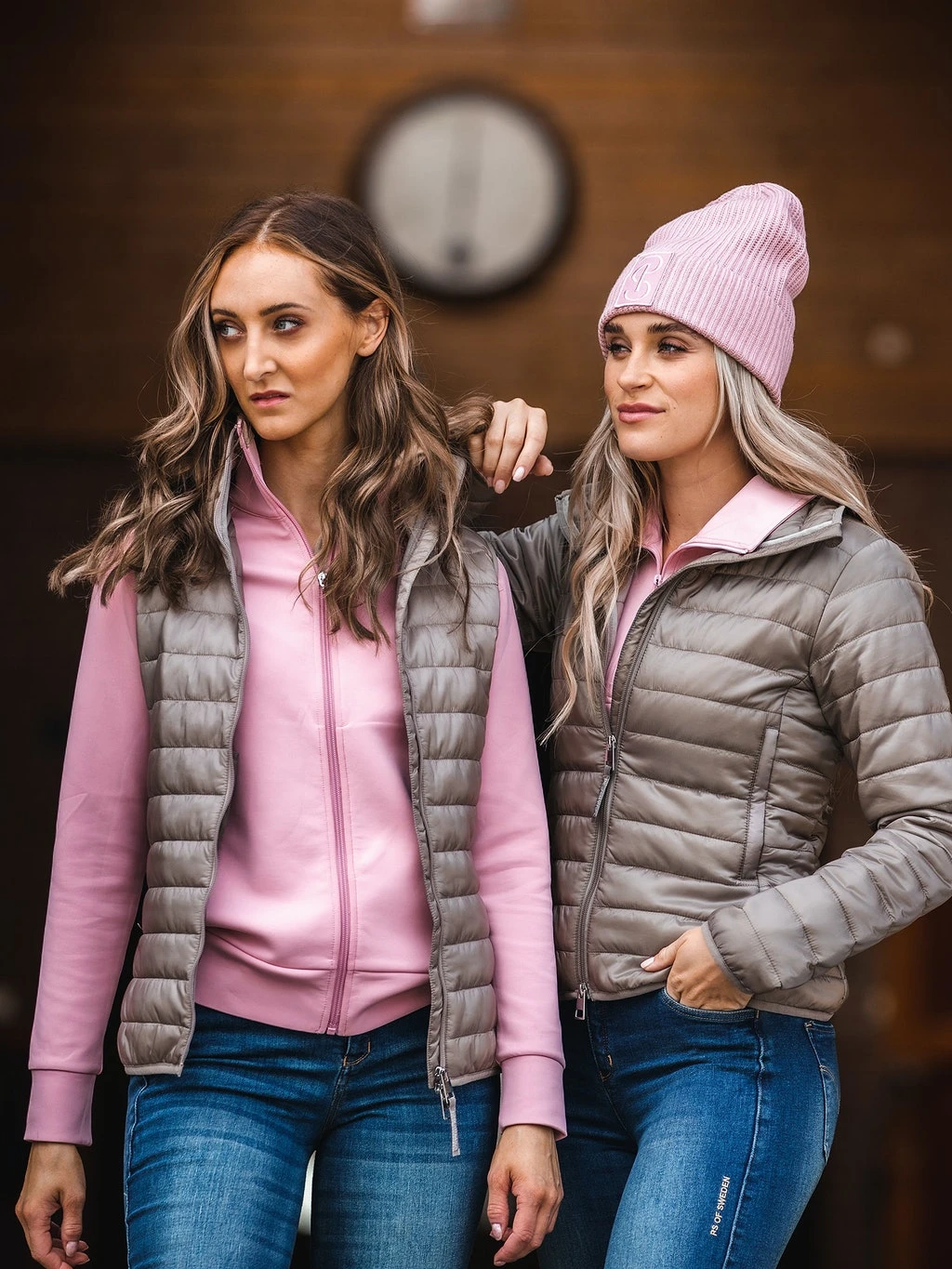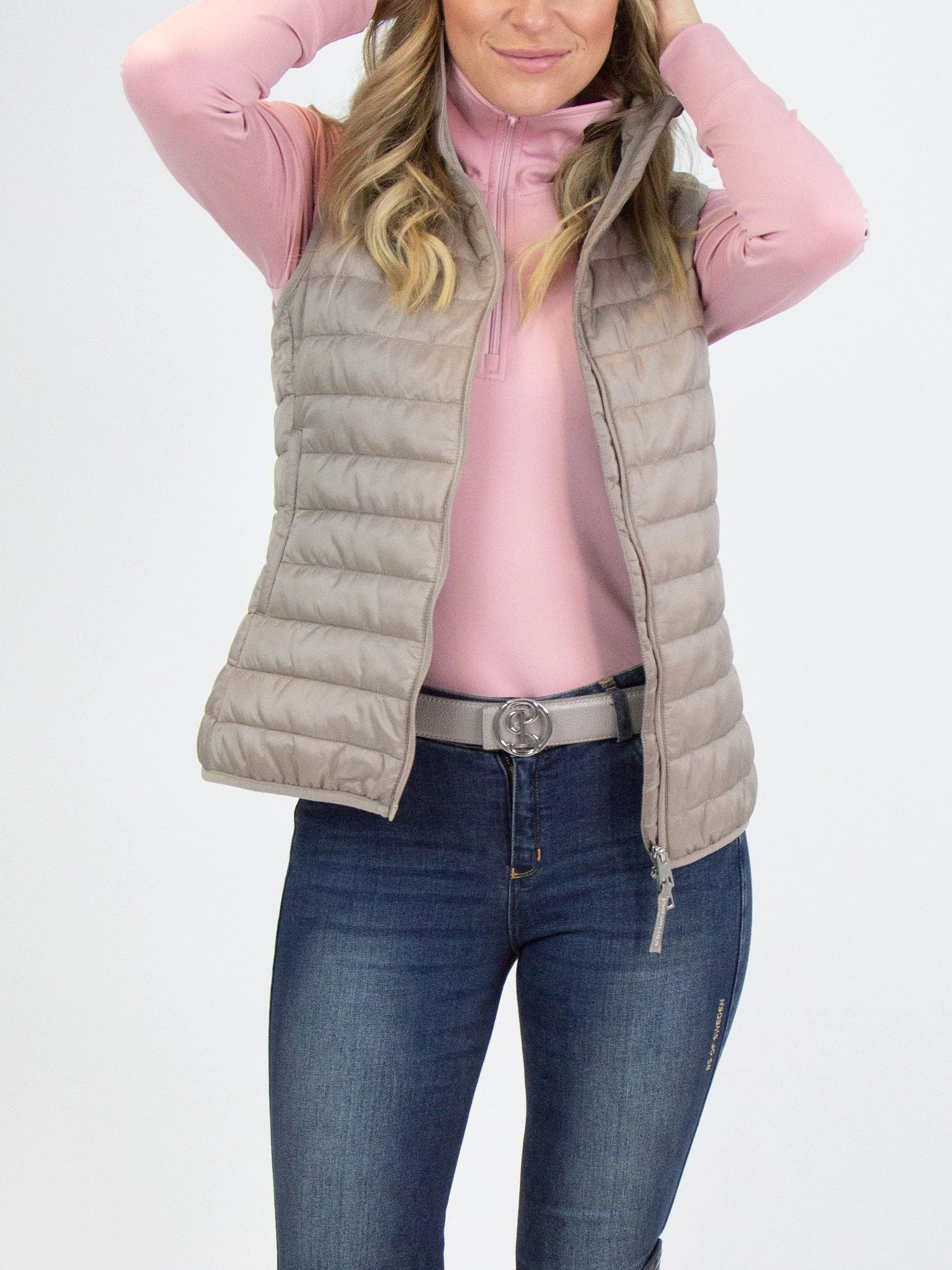 Light-weight padded vest with tall collar. Surface is shiny, and water resistant for soft rain, with contrast colored lining. Flattering fit with two-way zipper at front. Discrete and stylish details such as hidden zipped pockets, elastic bindings and PS logo stud at neck.